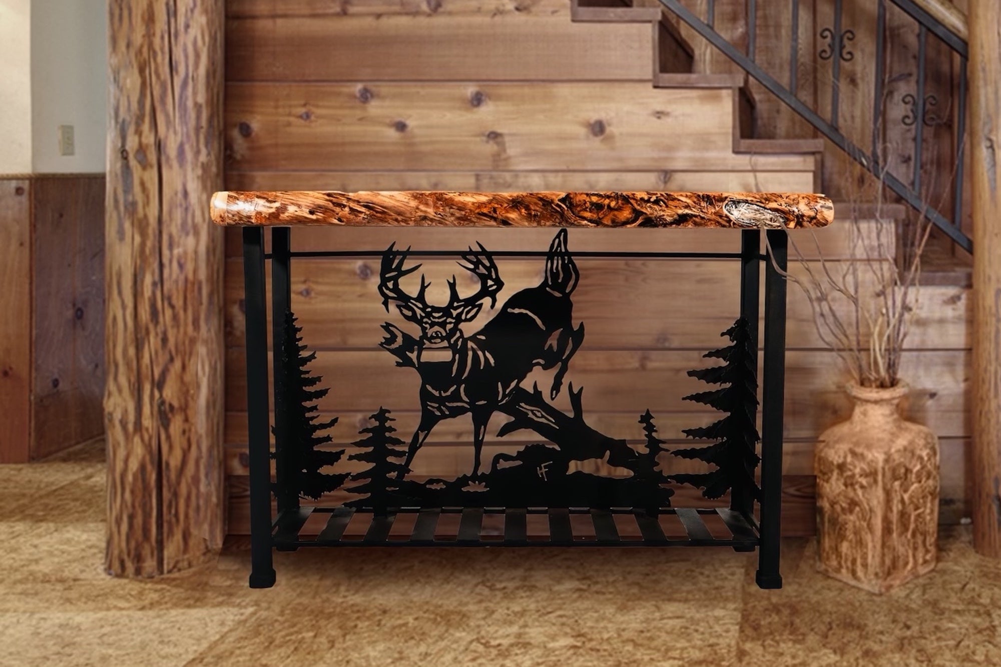 The Jumping Buck Scene Sofa Table is perfect for any rustic style setting, such as cabins, shop houses, and game rooms. This product features a 3-dimensional wooden deer scene, handcrafted from iron, as well as an aspen wood top with a live-edge finish.